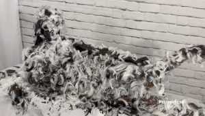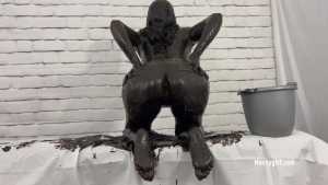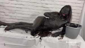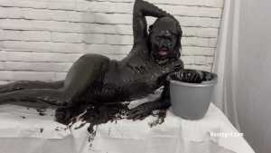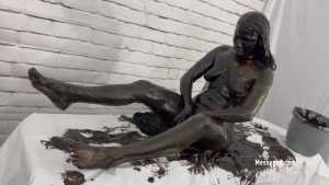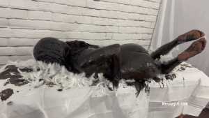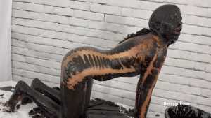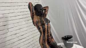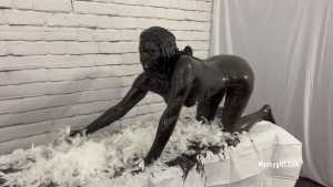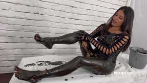 Sexy latina Sofia does her first grease shoot. She starts out in a dress with cut outs that exposes her body. So when she starts to cover herself, the holes will leave a pattern all over her body when the dress comes off. When she is covered head to toe, she slips out of the dress and it looks like she has tire prints all over her body. She then fills in the clean spots until she is totally covered. We thought we would make things more interesting, so we have her roll around in white feathers. She now looks like a sexy human chicken. She finishes herself off by playing with her gooey and fathered pussy. You also get a shower scene.