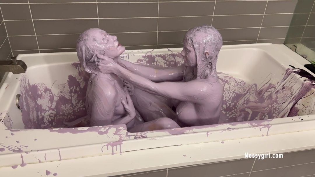 Besties Michelle and Courtney return for more messygirl play time. We put them in the bath tub and pour marshmallow cream on them and top it off with blueberry syrup. They mix it all up by rubbing on each other and turn into sexy lavender cream babes. You will enjoy watching them slip and slide as they get "friendly" with each other. You also get a POV camera angle that will give you the feeling of being in the tub with them. A shower scene is also included.